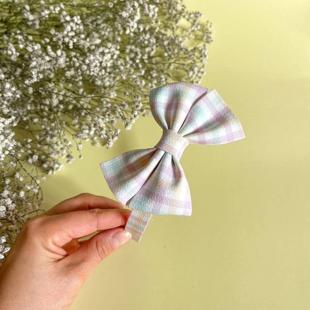Diadema rígida forrada con polipiel estampado vichy en tonos pasteles (lila, mint y amarillo), con lazo tamaño 10cm.