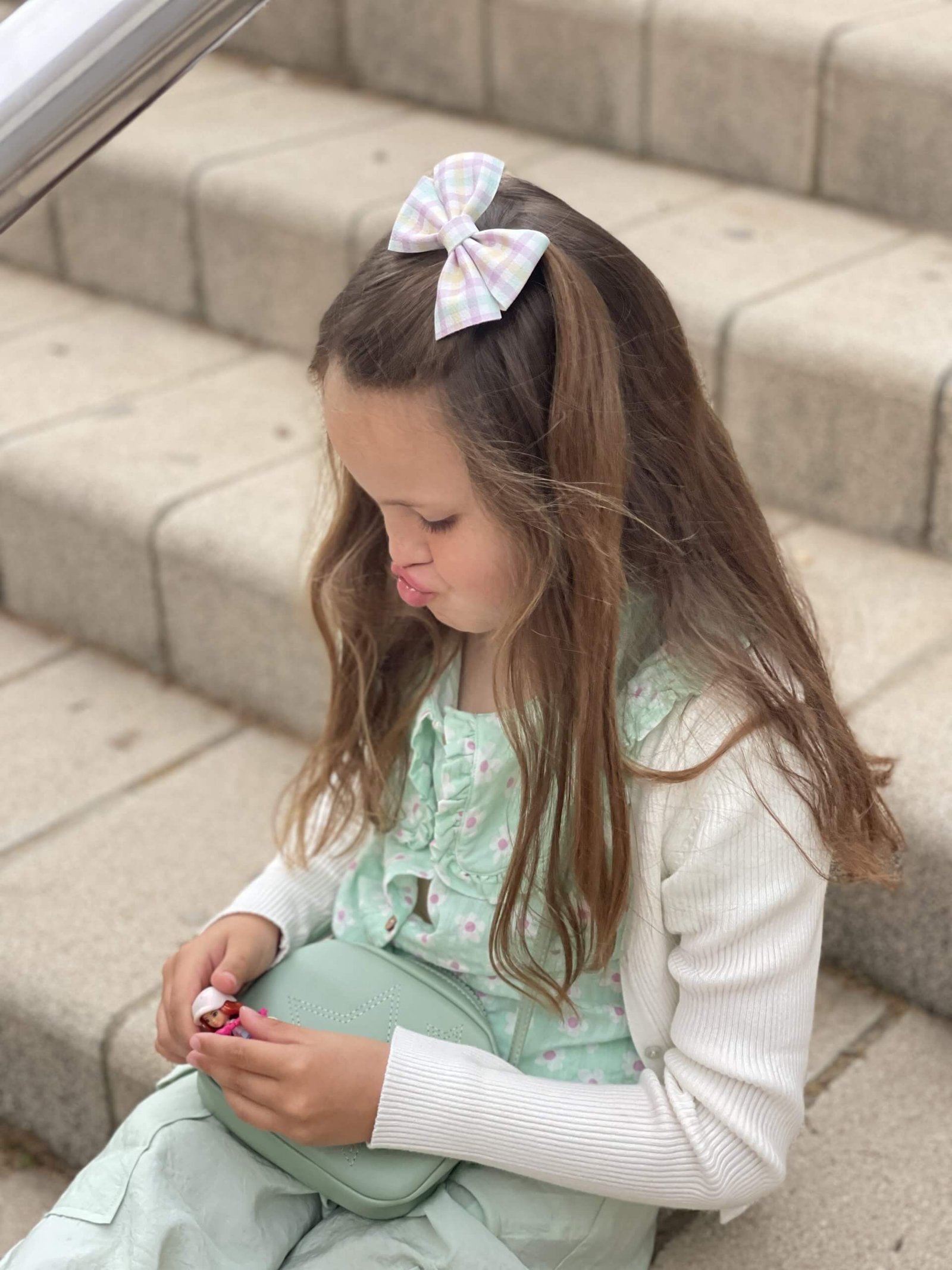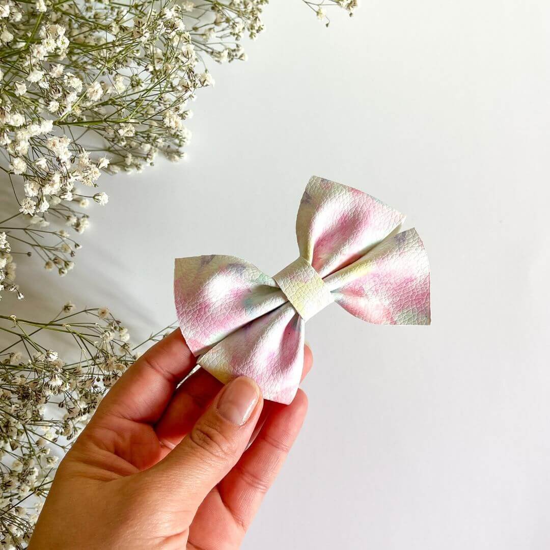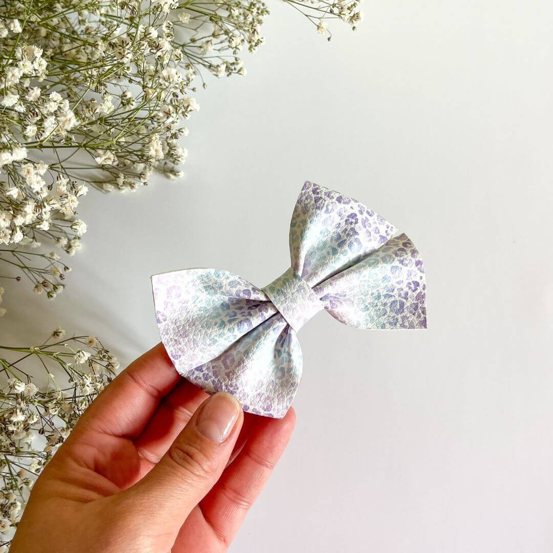 Pack compuesto de 4 lazos: vichy, tie dye, florecitas y leopardo lila